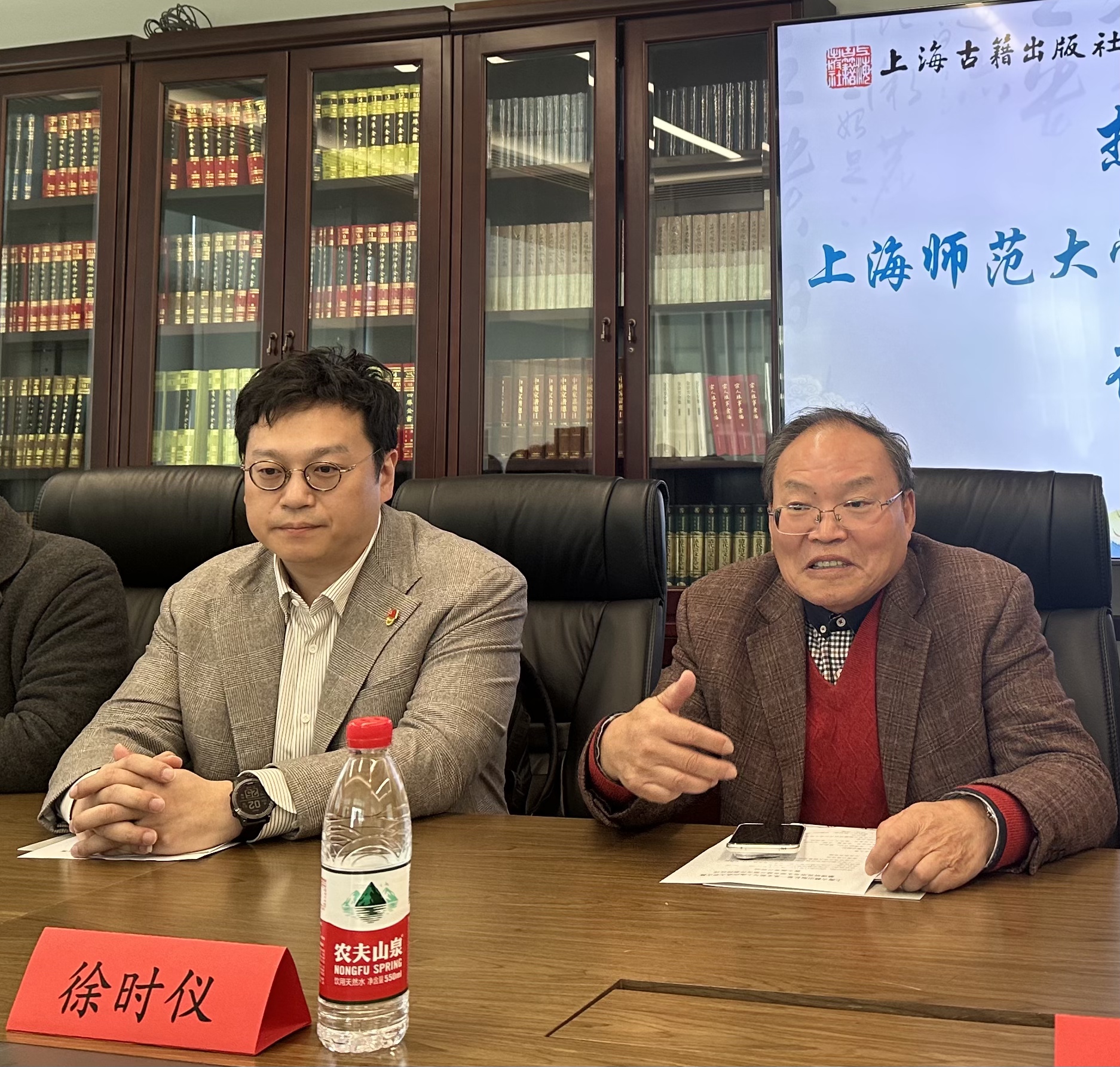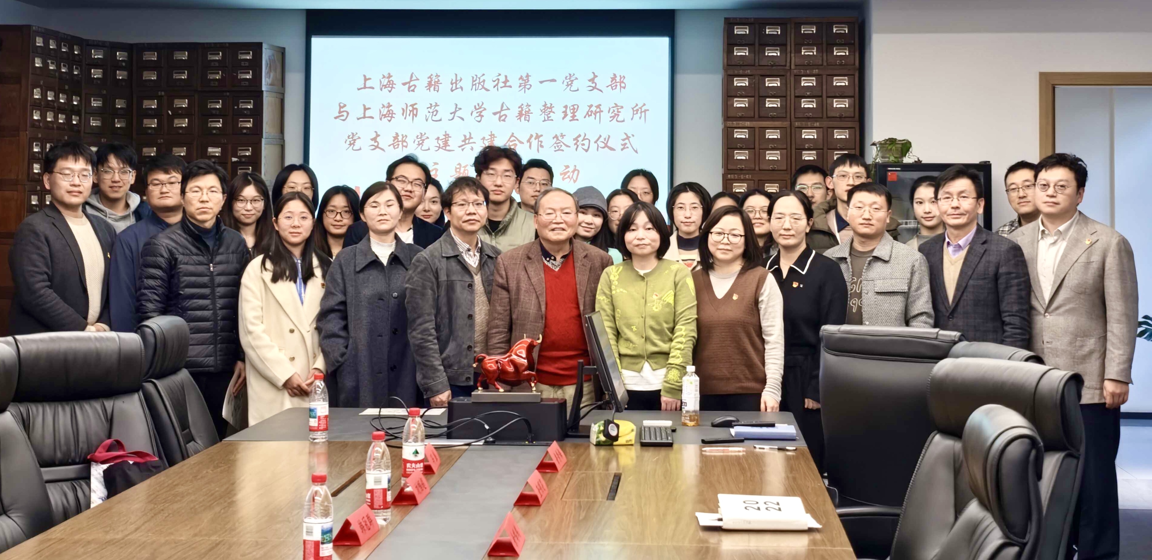 2025年11月19下午,人文学院教工第二党支部与上海古籍出版社第一党支部,在上海古籍出版社501室举行党建共建签约仪式暨主题党日活动。活动由上海古籍出版社第一党支部书记毛承慈主持。上海古籍出版社总编辑、党委副书记奚彤云、一编室主任杜东嫣、二编室主任曾晓红、三编室主任余鸣鸿、五编室主任查明昊、数字编辑室主任鲁秀梅,以及第一支部支委方颖、王子伟,党员郭冲,青年编辑代表徐卓聪等参加活动;上海师范大学古籍所徐时仪教授及人文学院教工第二党支部钟书林、潘牧天、韩冠群、刘帼超、杨永生、许超雄、张延和、冯盛、谢霞等参加活动。上海师范大学人文学院学生第23党支部、第47党支部部分党员学生也参加了此次活动。
