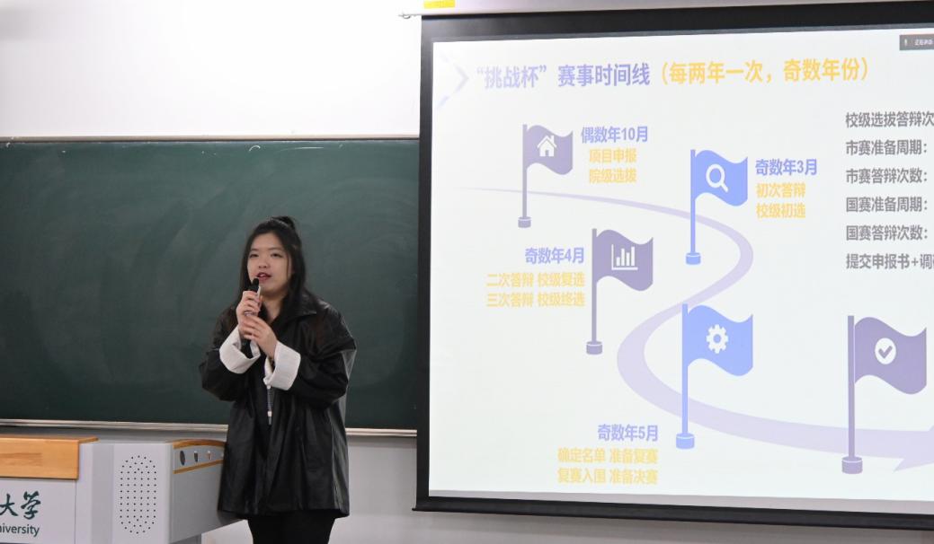 陆玫烨同学从竞赛介绍、备赛时间、备赛经验和信息分享四方面介绍中国国际大学生创新大赛。她建议同学们从参考往届项目、产学研成果转化、社会实践转化三方面确定项目选题、不断丰满自己的商业策划书,做到教育创新与数字技术的结合。