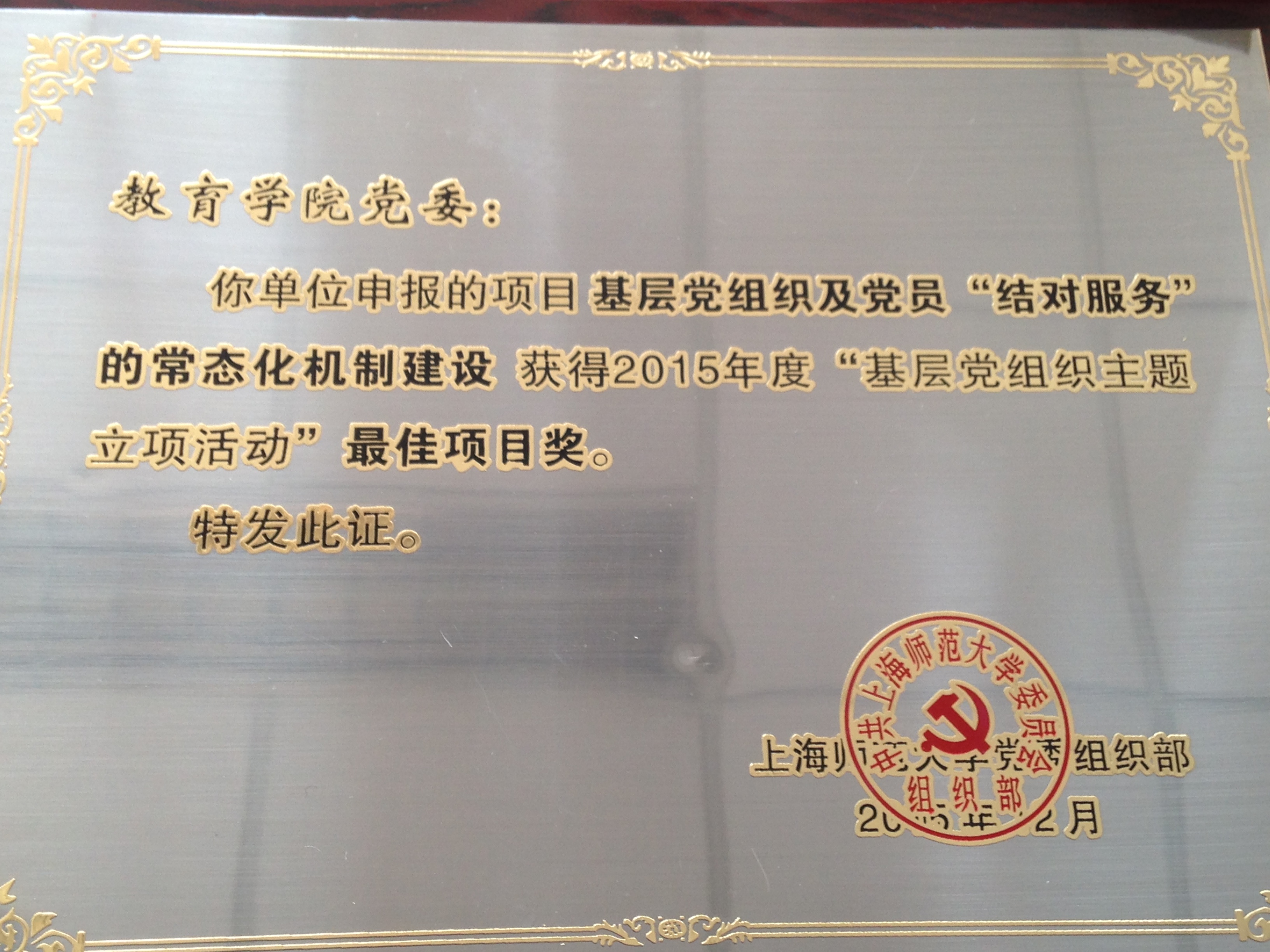 在校党委组织部举行的2015年基层党组织主题立项评比中,经线下专家评审和网络投票评选,教育学院党委申报的项目——“基层党组织及党员‘结对服务’的常态化机制建设”荣获全校十佳项目之一。2016年3月1日下午,校党委组织部举行了简短的颁奖仪式。