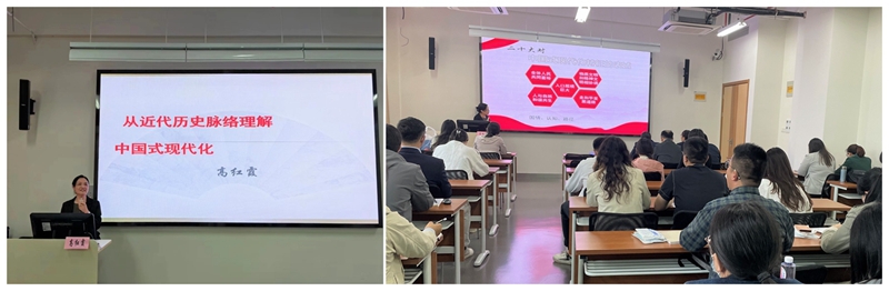学院邀请人文学院历史学系教授、博士生导师高红霞以“从近代历史脉络理解中国式现代化”为主题,从现代化范式、西方的现代化之路、近代中国式现代化的路径选择和中国特色社会主义现代化建设之路四方面展开。从历史发展视角,对比西方国家现代化进程,详细阐述了新时代中国特色社会主义现代化道路相关理论,结合党的二十大报告,分析了中国式现代化的主要内容和本质要求。通过专题培训,对于增强学院教职工思想政治素养,增强“四个意识”、坚定“四个自信”、做到“两个维护”,正确理解中国式现代化、全面把握党的二十大精神具有重要意义。